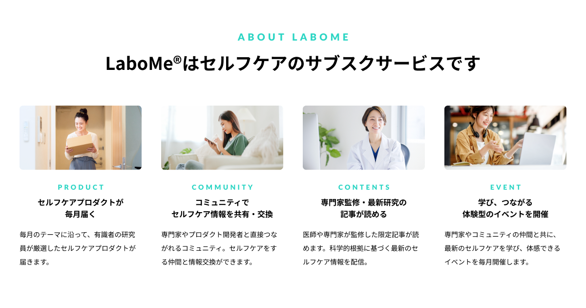「LaboMe®」は、女性が自分らしい心とからだで生きるためのセルフケアをサポートする、サブスクリプション形式のプロダクト&コミュニティサービスです。毎月設定したテーマに沿って、「LaboMe®」研究員(当社研究所所属の従業員)が様々なジャンルから厳選したセルフケアプロダクトを会員の皆様にお届けする他、コミュニティでセルフケア情報を共有・交換していただくことができます。同コミュニティでは、女性の心とからだに関する情報(医師などの専門家の監修による記事や最新研究に関する記事など)の提供も行います。また会員の皆様にご参加いただけるイベントの実施も予定しています。