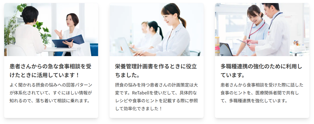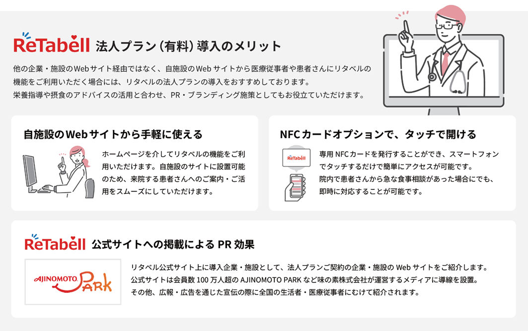 味の素株式会社(社長:中村 茂雄 本社:東京都中央区)は、この度、摂食の悩みに対応した「ReTabell(リタベル)」サイト(以下リタベル)を刷新し、医療施設・企業向けASP(Application Service Provider)※1事業を開始しました。同事業は当社が第一三共株式会社(社長:奥澤 宏幸 本社:東京都中央区、以下第一三共社)との協業により展開していたAI搭載献立支援サイト、リタベルを栄養指導・食事相談支援サイトとしてリニューアル開設し、従来サイトから利便性やユーザーからの情報発信力を高めた医療施設・企業向けの法人用サービスに進化させ、社会実装を進めるものです。