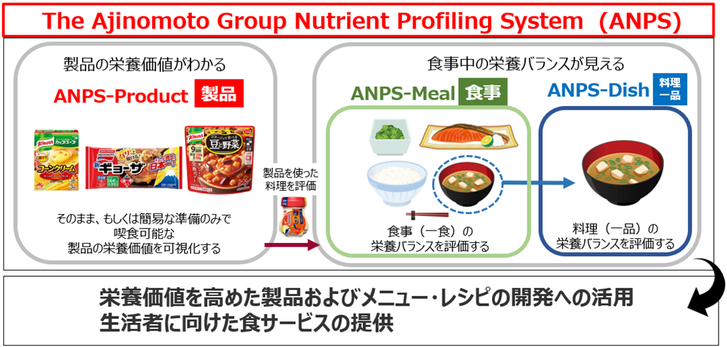 当社グループでは、これまでに食品中の栄養素をスコアで可視化する独自のNPS(The Ajinomoto Group Nutrient Profiling System: ANPS)を開発し、2020年に製品用(ANPS-Product)、2021年には料理用(ANPS-Dish)の導入を開始しています。しかし、日本では複数の料理を組み合わせて食事をすることが一般的であり、食事(一食)の栄養を評価できる食事用NPS(ANPS-Meal)も必要であると考えられていました。