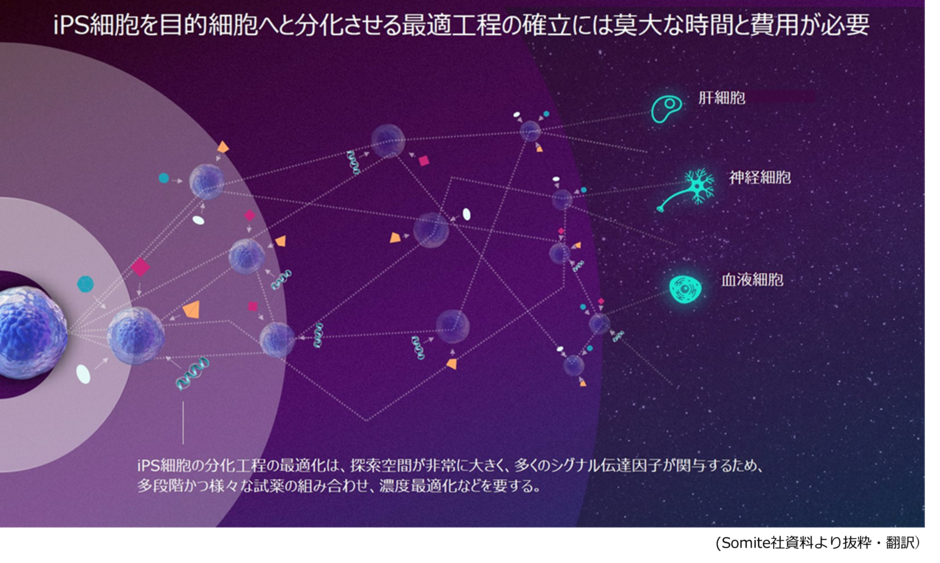 Somite社は、発生生物学・幹細胞生物学・遺伝子解析技術分野の世界トップクラスの教授陣とAI専門家が結集し、iPS細胞から分化可能なあらゆる細胞の製造法について、デジタルツインを用いて最適解を提供できるプラットフォーム技術の開発を手掛けています。同社技術の応用により、iPS細胞からの細胞分化を従来と比べ短時間かつ安価に最適化することが可能となるため、細胞治療・再生医療の課題解決に向けた効率的なアプローチとしての実用化への貢献が今後期待されます。