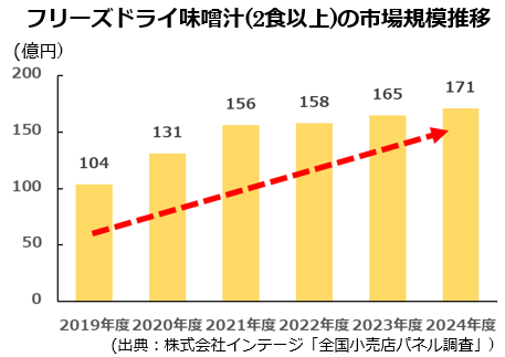 フリーズドライ味噌汁(2食以上タイプ)の市場規模は、コロナ禍の内食率の高まりにより急拡大した後も伸長が継続しており、2024年度には2019年度比約165%(約171億円)と中期的に拡大しています(右図参照)。