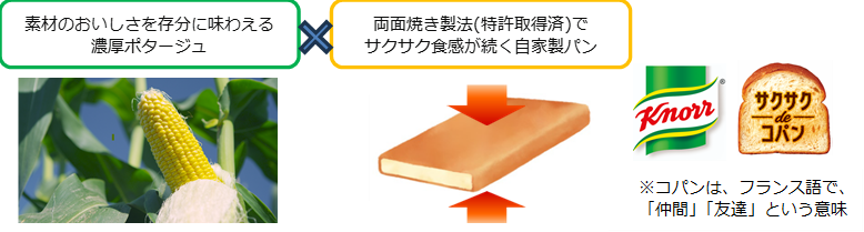 製品名にある”コパン”は、フランス語で「仲間」「友達」という意味です。「サクサク食感が最後の一口まで楽しめる、おいしいパンが入った濃厚ポタージュで、忙しいみなさんの食事のひとときが少しでもゆったりと過ごせる時間になれば。そして、そのお供となれたら。」という想いが「クノール® サクサクdeコパン」には込められています。