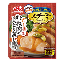 「スチーミー®」初の”鶏むね肉”用品種です。独自の配合と圧力スチームパウチにより、レンジ調理でも鶏むね肉がしっとりおいしく仕上がります。ソースは鰹と昆布のだしを合わせた和風の味付けで、夕食の主菜にピッタリです。